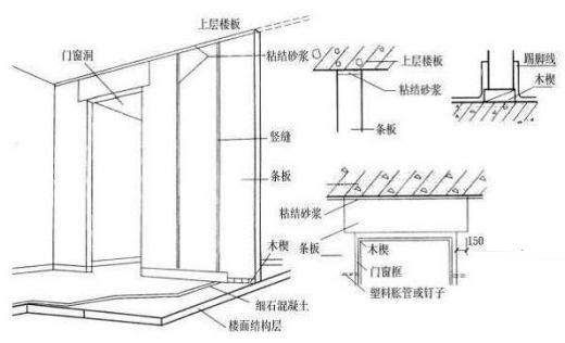 在地面上沒有做好鑿毛清潔工作,填塞不嚴(yán),造成墻板與地面連接不牢;或隔墻板與兩側(cè)墻面及板與板之間的膠黏劑與板材不配套,造成黏結(jié)不牢,出現(xiàn)縫隙。所以切割板材時,一定要找方正。地面上突出的砂漿、混凝土塊等必須剔除并清掃干凈。膠黏劑一定要配套使用。