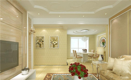 此圖中整體用色比較溫馨,由大量的黃色裝扮而成,從家私的運(yùn)用上可以感受到一股濃濃的歐式氣息,天花板上的白色花形吊頂與整個(gè)客廳的裝修完美搭配,遠(yuǎn)處餐廳也是石膏板吊頂,但造型差異大,豆呈現(xiàn)出了高雅與別致。