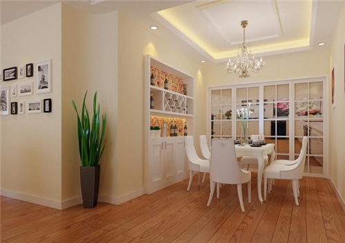 這張圖中的空間為就餐廳,面積比較局限,為了不造成壓抑之感,頂部運(yùn)用了較為簡(jiǎn)單的吊頂造型,這也是許多家庭的首選,暖暖的燈光從木工吊頂縫隙透出,讓這個(gè)空間充滿了溫馨感,同時(shí)也能增添人的食欲。