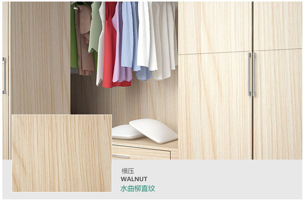 第一個告訴大家,所謂環(huán)保分兩塊,第一個,柜體里面本身是有基材的,基材是實木顆粒板,如果要達到環(huán)保,這個叫飾面,裝飾的飾,貼面的面,叫飾面層,飾面層在壓板的過程當中,還會涉及到甲醛的問題,如果貼面是不環(huán)保的,衣柜味道會非常大,一套衣柜好的話,大家可以把鼻子伸進去聞一下,如果聞到一點點刺鼻的味道,那這就是不環(huán)保的;如基材是生態(tài)板,生態(tài)板也是有環(huán)保等級的,我們要選擇EO或E1級的才能確保環(huán)保。